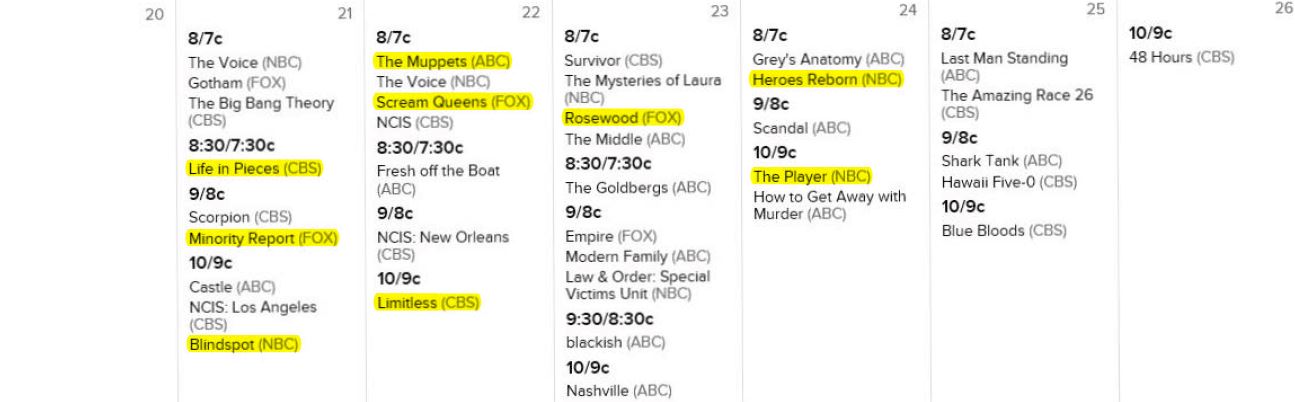Last word: I’m looking forward to checking out these new shows in priority order: Blindspot, Heroes Reborn, Minority Report and The Player. I’ll be back with more soon!